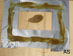 One of the egg masses we found was on a board in the garage. It apparently had been deposited on the board the previous summer. We brought the board out of the garage and built a barrier of duct tape and tanglefoot around the egg mass. We then took photos every day until the eggs started to hatch and for a few days after. The gypsy moths started to hatch on April 21st, 2008. See photo sequence below: