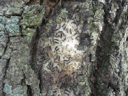 Last summer we took photographs of egg masses that gypsy moths had laid on trees, including this tree on McKendimen Road. The egg masses were still there in the early spring of 2008. We took photographs of the gypsy moth larvae as they were hatching from these egg masses on April 22, 2008.